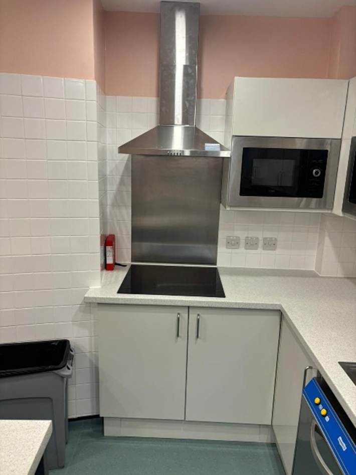 The previous kitchen was a small run, lacking space for shared usage and storage. They did not want the kitchen to be complex or over-equipped. All they needed was a hob, some microwaves, and a dishwasher, because they were all they every used. However, they did want to expand the kitchen area to make it more comfortable and user-friendly. That required knocking through an old toilet block that could be converted into more kitchen space.