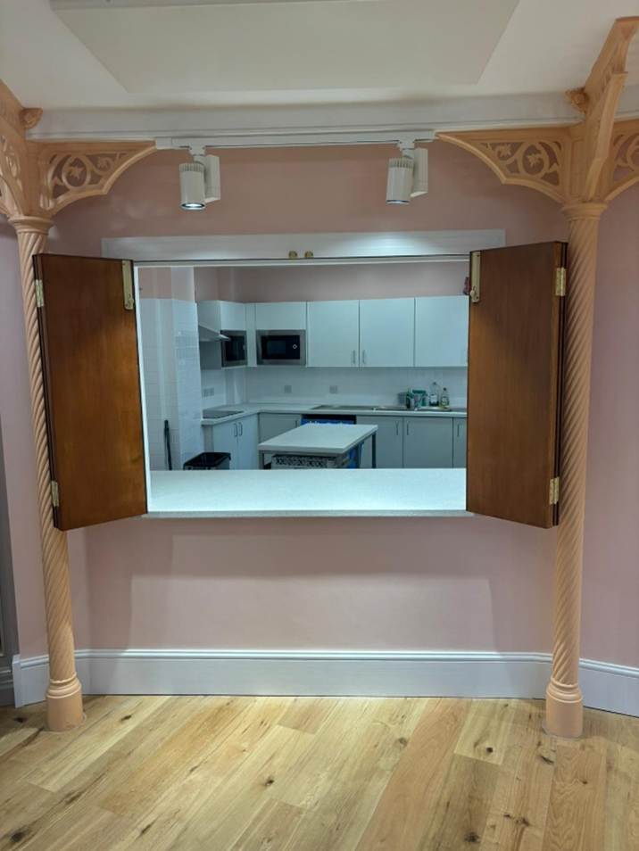 Although there was some dramatic work to the footprint, it was important not to lose any of the kitchen’s character and features which were the same as those in the wider building — the distinctive pink walls, white beams, and peach columns.