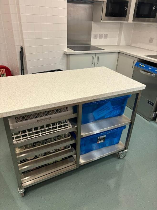 On Steelplan’s advice, the church opted for a mobile island. That offers both an extra work surface, and a handy storage solution for dishwasher trays, and other tray storage, which the client found especially useful.